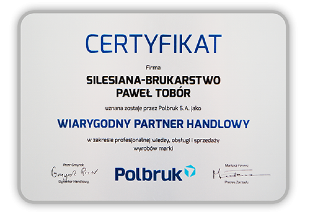 "Silesiana - Brukarstwo" została doceniona przez największego producenta kostki brukowej i galanterii betonowej w Polsce firmę Polbruk S.A., otrzymując świadectwo wiarygodności w zakresie profesjonalnej wiedzy, obsługi i sprzedaży wyrobów tej marki. Dziękując za to wyróżnienie, deklarujemy dalsze zaangażowanie i ciężką pracę na rzecz wspólnego partnerstwa.